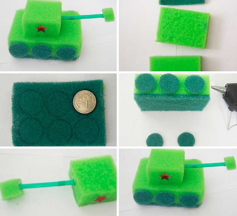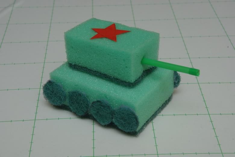 В по-малката гъба се прави дупка и в нея се вкарва памучна пръчка (това е оръдието на танка). От цветна хартия се изрязват колелата и се залепват от двете страни на долната гъба. Готови за занаятите.