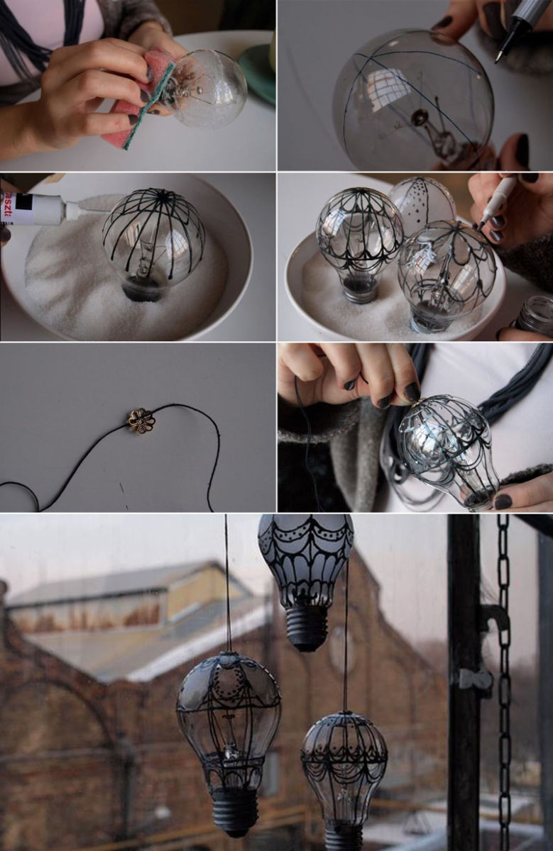 Мечтаете да пътувате през новата година? Намекнете за това на главния новогодишен магьосник, като направите балон от крушката! Основата му ще служи като кошница за пътници, а стъклената част може лесно да се изрисува с маркери или бои, да се украси с мъниста, кристали или пайети.