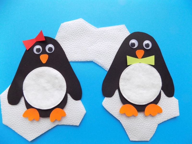 За работата са достатъчни парчета бяла, оранжева и черна хартия или цветен картон. Клюнът и готовите очички ще вдъхнат живот на нелетящата птица от далечните брегове на Антарктида. С овално тяло, бели гърди и сърцевиден клюн всичко е готово.