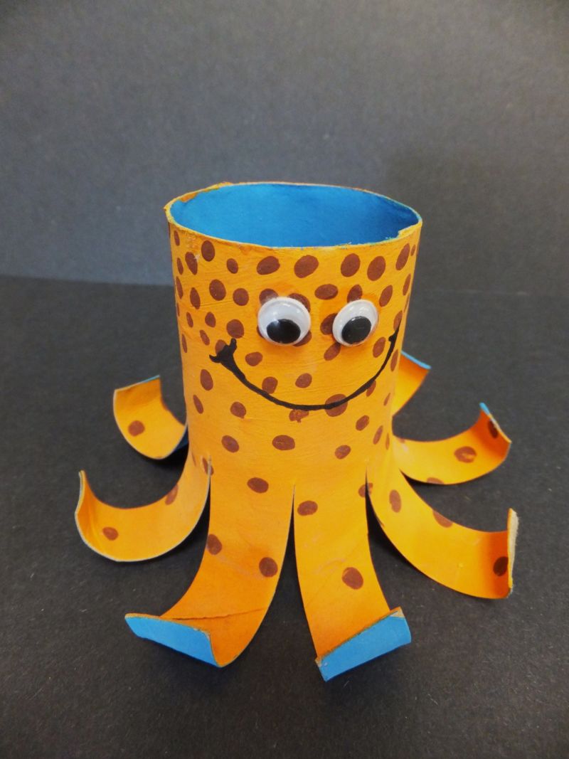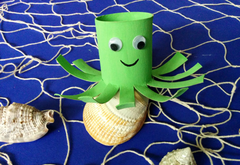 Сред най-простите детски занаяти е веселият октопод. Можете да направите цяла компания от различни цветове. Използвайте ръкав от тоалетна хартия, подплатен с цветна хартия, изрязана на крачета.