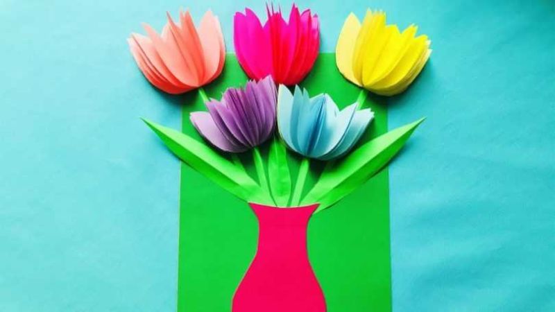 Най-популярната тема за занаяти от хартия са цветята. За основа е най-добре да изберете нещо просто и доста разпознаваемо - роза, маргаритка, лале. Обемните цветя от цветна хартия могат да се сглобят в букети, като с тях се напълнят малки вази.