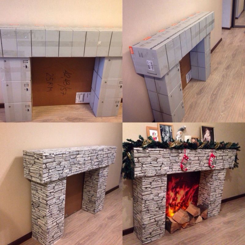 По-сложен начин за декориране на интериора със занаятчийски изделия от картон е да се оборудва дневната с изкуствена камина с червени чорапи за коледни подаръци, както правят в Европа.