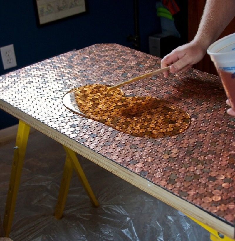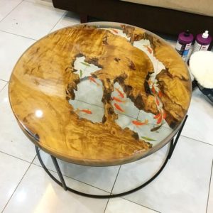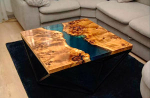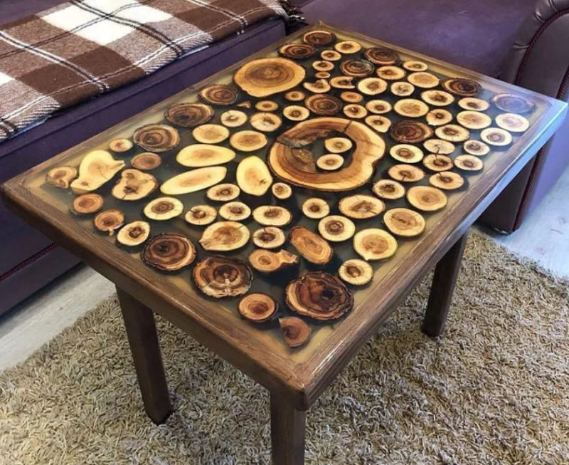 Епоксидната смола се използва доста често за създаване на оригинални мебели. В тази роля могат да се използват най-различни предмети, сувенири и играчки. Дебел слой полимер придава ярък блясък и гланц на бъдещия продукт.
