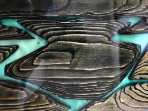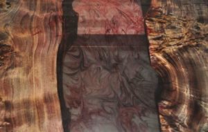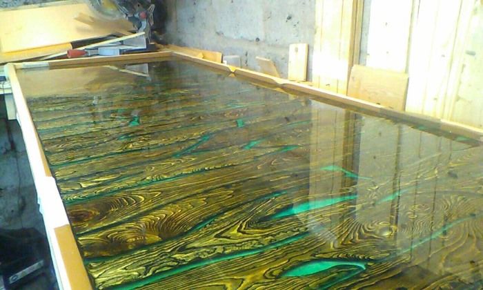 - Следващата стъпка е изработването на калъп за отливане. Заготовката за маса се поставя в тази форма. В зависимост от желанието на собственика лентите от смола (прозрачните зони на плота) могат да бъдат поставени в центъра или по краищата.