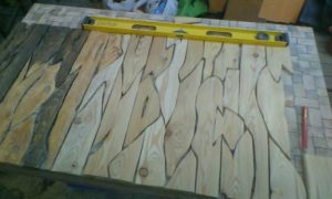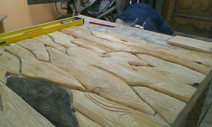 - Дървесината се подрежда в чисто и сухо помещение (обикновено работилница) в съответствие с избраната схема. Ако желае, занаятчията може да издълбае дървото, като придаде на бъдещото изделие желания релеф.