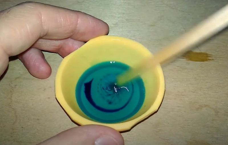 - Смесете двата компонента в отделен съд и ги разбъркайте добре до хомогенност. Ако по шпатулата се образуват бучки, по-добре е да смените шпатулата.