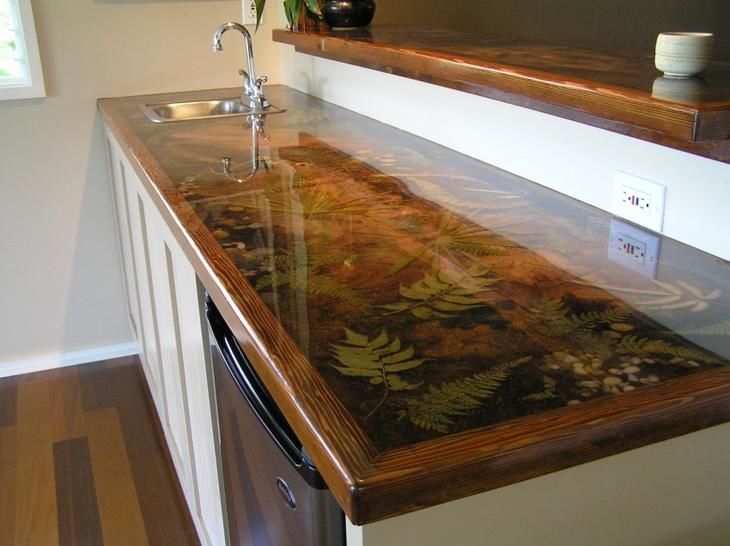 - Отливането на декоративен плот е известно като по-амбициозен проект. В този случай занаятчията има възможност не само да използва солидно платно за основата, но и да възстанови повредени дървени маси с помощта на леене на смола.