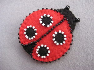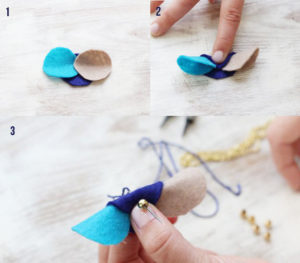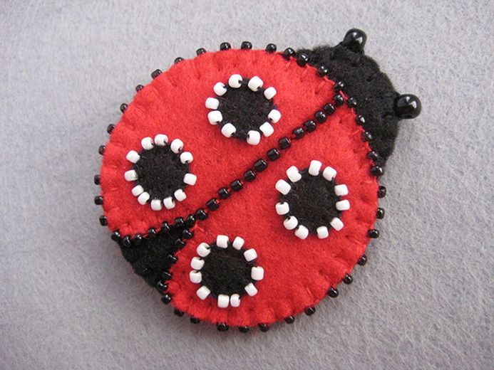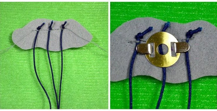 Върху кръгла основа, изработена от дебел филц, от едната страна се залепва щифт, а от другата страна се поставя избраният декор, от който се образува определен състав.