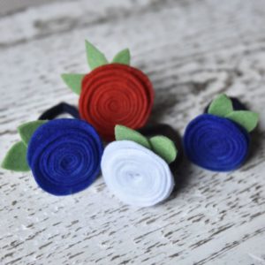 Достатъчно плътният материал се използва за изрязване на елементите, от които се сглобяват цветята - бели маргаритки с жълт център, пищни розови или бели божури и червени рози.