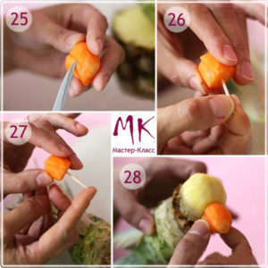 - Морковите се използват за направата на гребена и носа на птицата. Сглобете главата на папагала, като използвате грах за очи. Използвайте клечки за зъби, за да прикрепите всички части на главата;