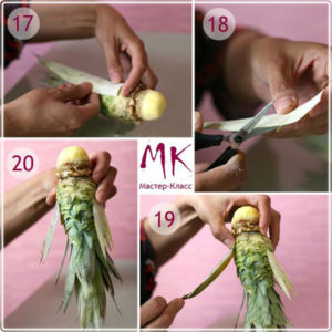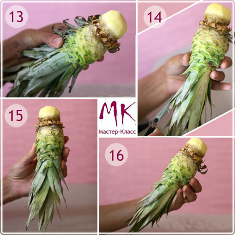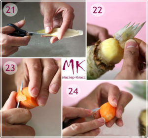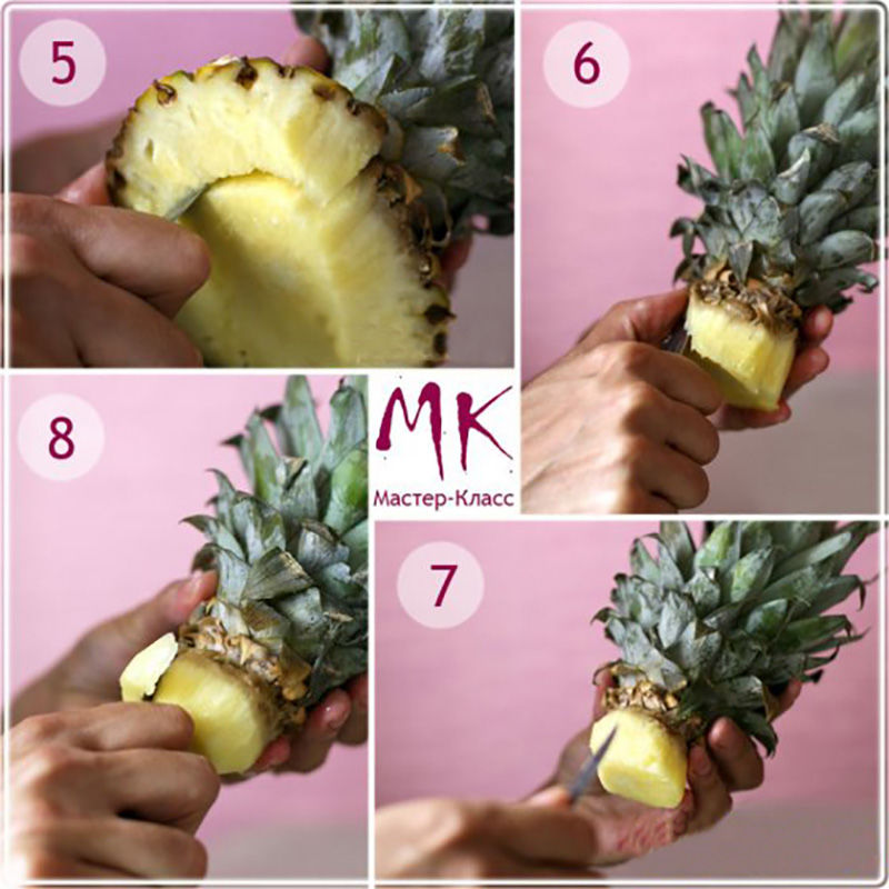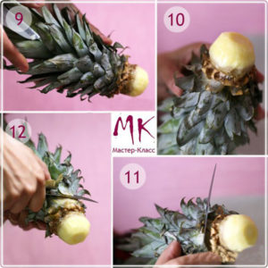- Първо отрежете горната част на ананаса, като оставите част от плода върху него. Отрежете кората отгоре в кръг. Резултатът е малък цилиндър. Придайте му формата на глава;