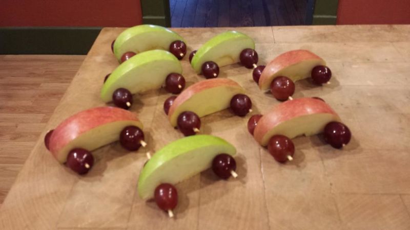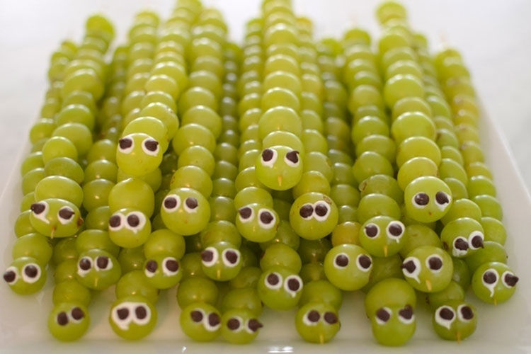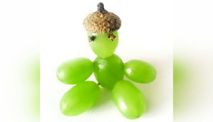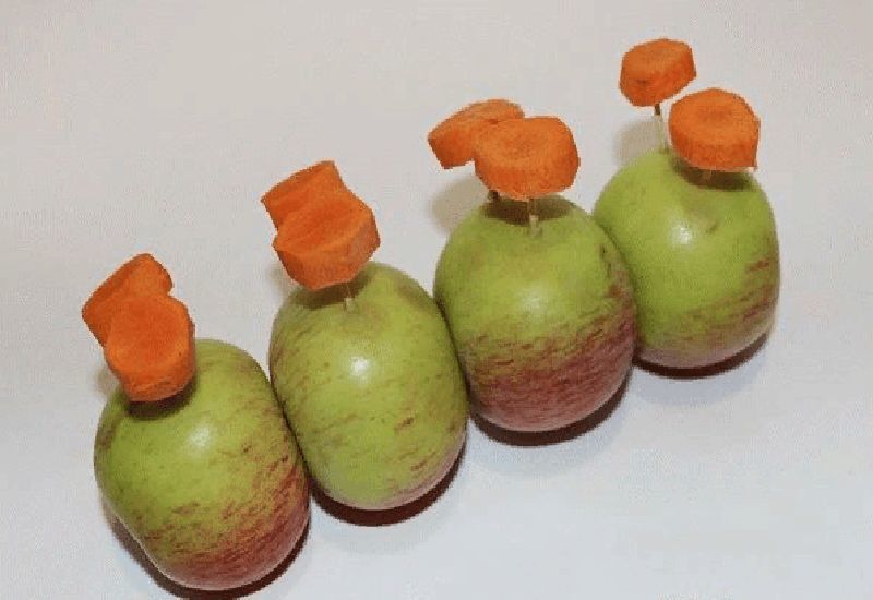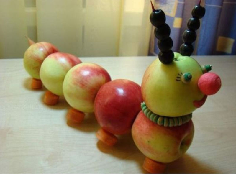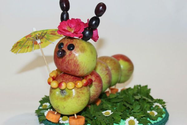 - След това вземете един морков, нарежете го на кръгчета и го прикрепете към двете страни на ябълката с помощта на клечка за зъби. Това ще са краката на гъсеницата. След това продължете да работите с лицето. За да направите това, вземете ябълка, като направите очите върху нея, използвайки готов продукт или ръчно изработен картон. Носът е направен от грозде, прикрепено с клечка за зъби. Можете също така да направите рога на животното с грозде;