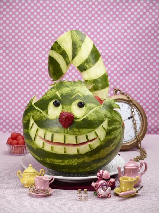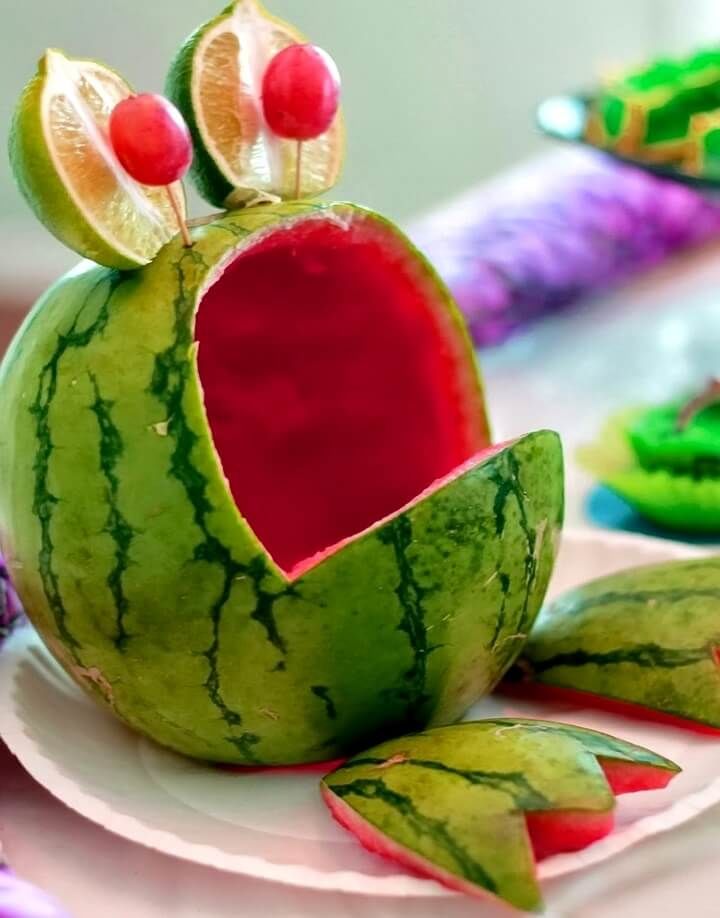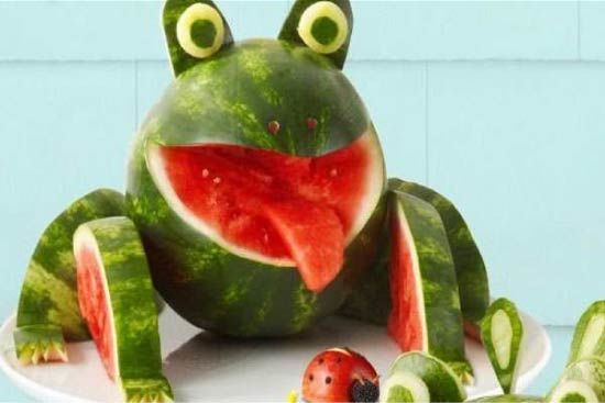 - От изрязаната част на динята направете краката на жабата. Съставът е готов!