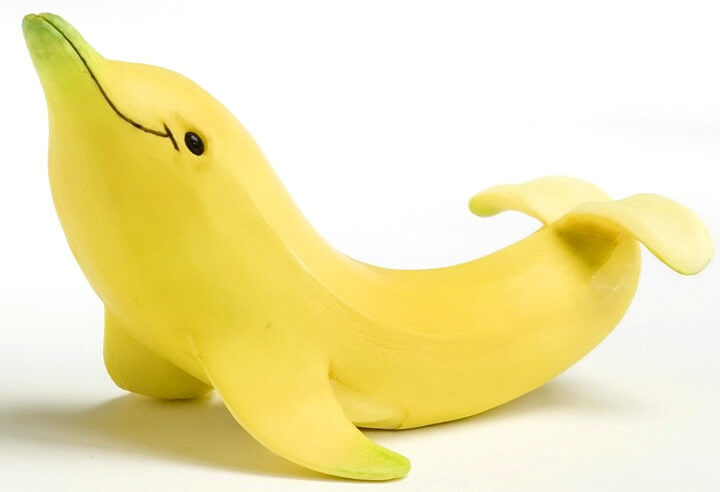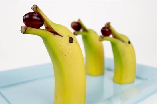 - Бананът се разрязва на две половини, като се взема частта от плода с опашката. Използвайте остър нож, за да разрежете леко под ъгъл устата в областта на опашката. Направете малки разрези за очите на делфина, като поставите карамфил;