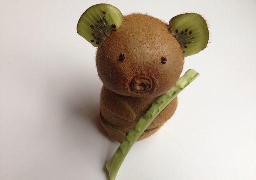 - Вземете едно от кивитата и го разрежете наполовина. Едната половина ще бъде тялото на коала. От другата изрежете ушите на животното и пръчка от любимия му евкалипт;