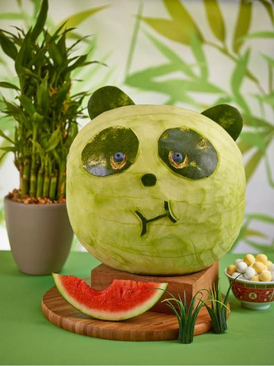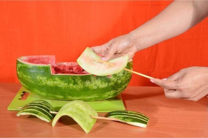 - Първо направете знак върху динята с химикал, за да изрежете устата на жабата. След това разрежете по маркираната линия, като отстраните месестата част и семките от плода (внимателно с помощта на супена лъжица), измийте и подсушете динята;