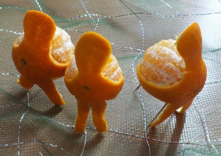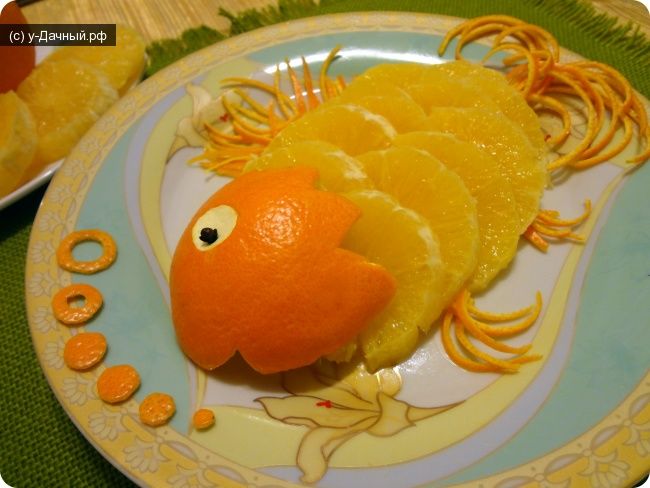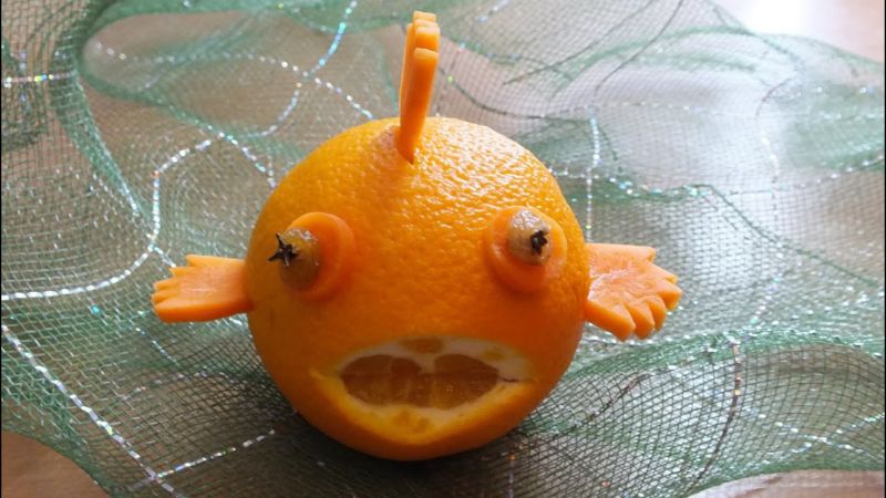 - След това леко разрежете портокала в частта, където ще бъдат перките. Поставете заготовките им в разреза. Занаятът е готов!
