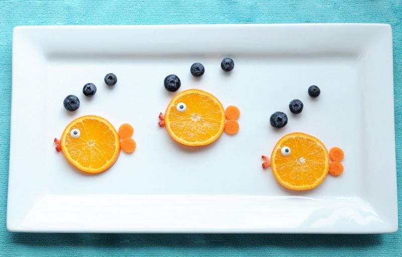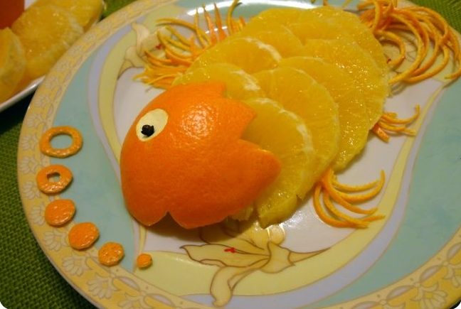 - С помощта на клечка за зъби (половината от нея) направете очите на рибата, като съедините кръгчетата моркови, султана и карамфила;