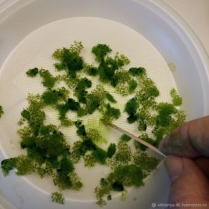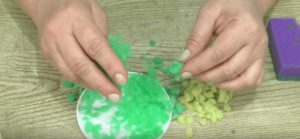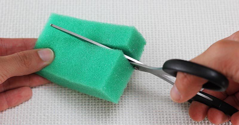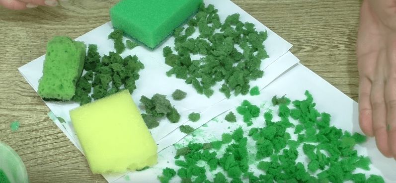 - Меката част на гъбата се навлажнява с вода, за да се премахне статичното електричество, и се нарязва на малки парченца.