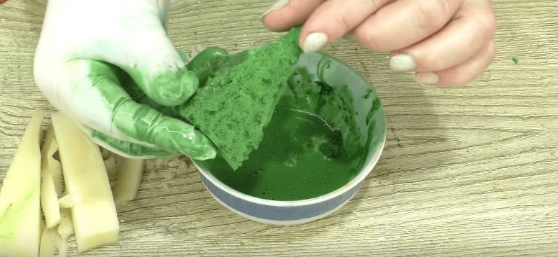- Дървото е нарисувано, като е потопено в зелена акрилна боя. Когато пенопластът попие боята, изстискайте излишното количество, поставете го върху суха повърхност и го оставете да изсъхне.