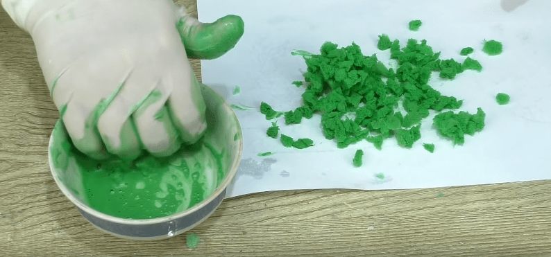 - Разредете акрила с вода до гъста консистенция, потопете всяко парче пяна, изстискайте го и го поставете върху лист хартия, за да изсъхне.