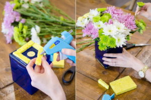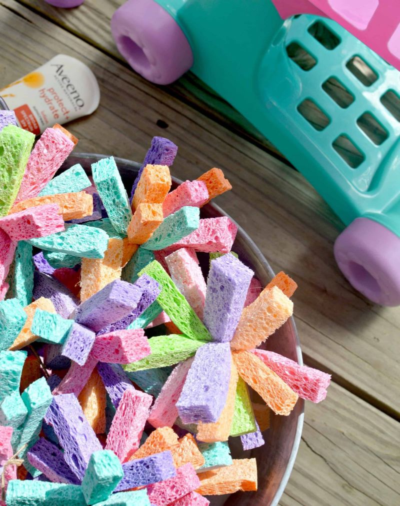 - След това пристъпете към изработката на самата кутия за игли. В зависимост от идеята изрежете кръг, правоъгълник или квадрат от цветната гъба. Пенопластът се реже лесно и децата ще се забавляват много с тази дейност.