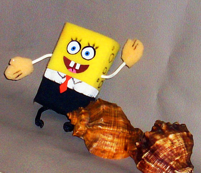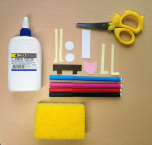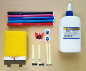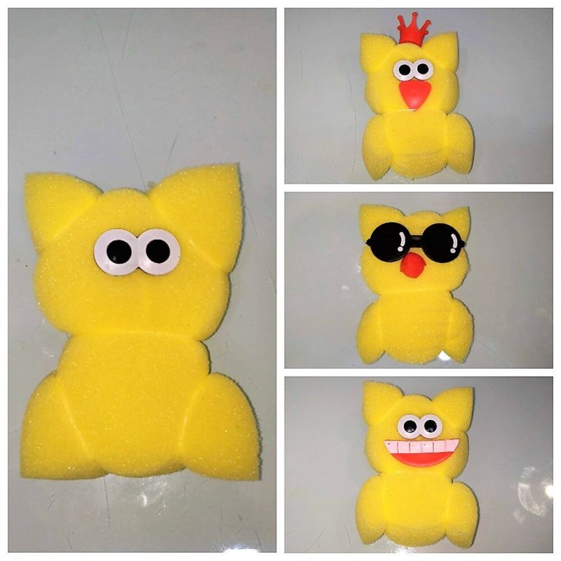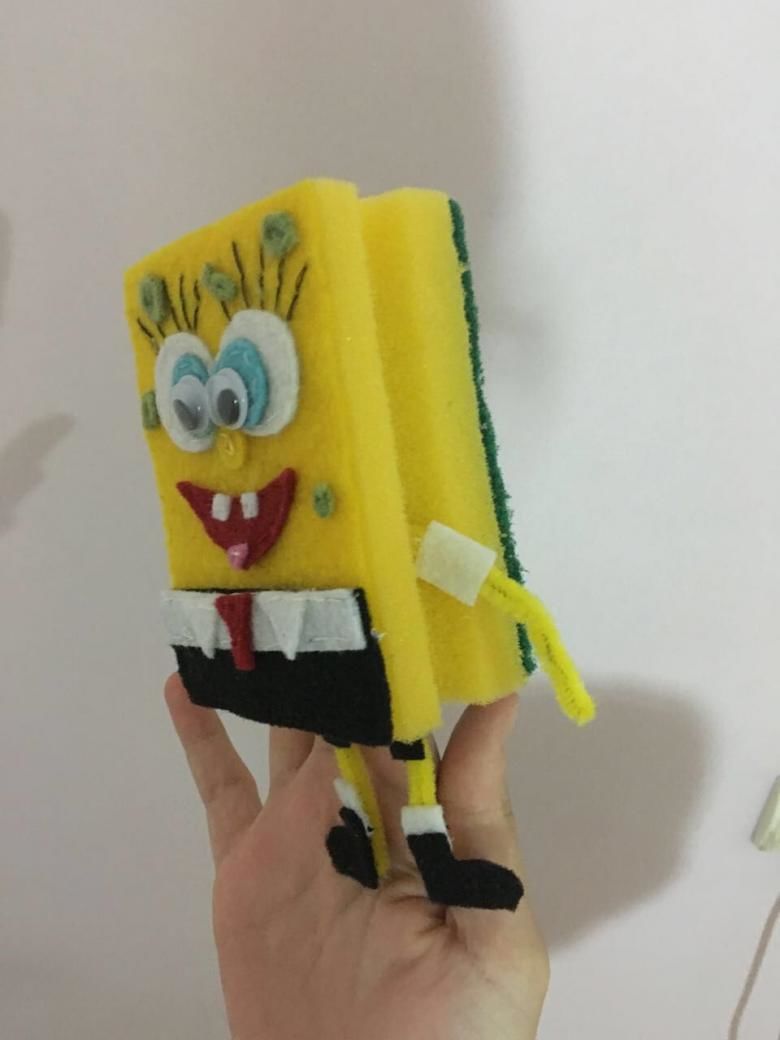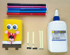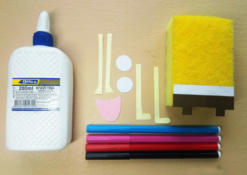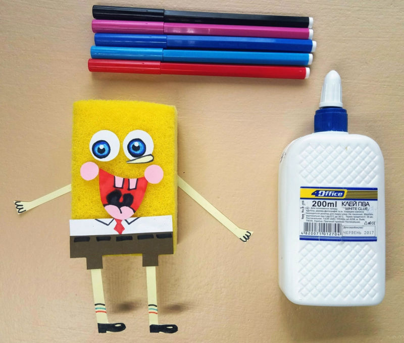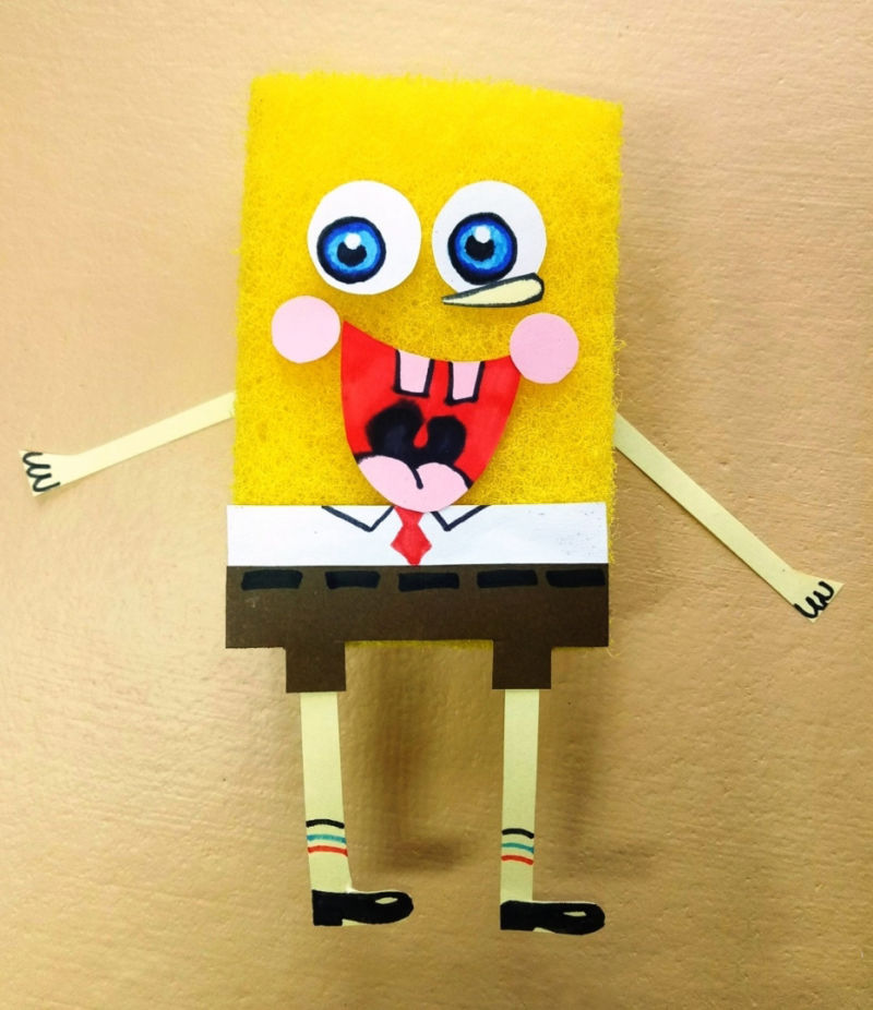 Направете любимия си анимационен герой от жълта гумена гъба. Правоъгълната форма на избрания занаятчийски материал повтаря формата на главния герой. Затова децата ще трябва да залепят само необходимите готови части.
