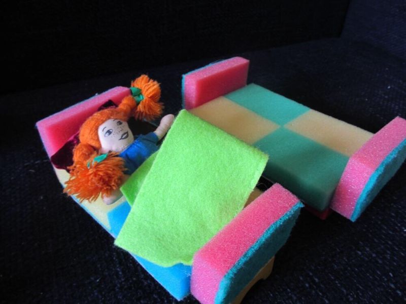 Освен това можете да изработите мебели от кухненски гъби за готварски съдове. Формата на материала за изработка е идеална за създаване на дивани, масички, кресла и детски легла за играчки.