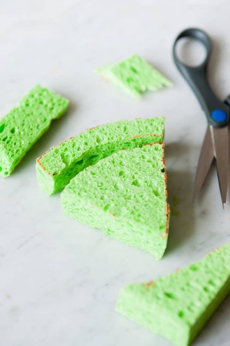 - Стъпка 3: Нарисувайте триъгълник върху втората гъба и го изрежете. Така се получават две части за бъдещата торта с играчки.