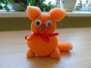 Можете да си направите игриво коте от пенопласт. Необходими са ви гъба, бели ластици и скалпел (можете да използвате и нож).