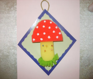 - Подготвените парчета се залепват плътно върху основата, а останалите парчета се използват за направата на трева, като се изрязват краищата. Трябва само да нарисувате белите петна върху шапката с гваш. Иглодържателят "Мухоловка" е готов.