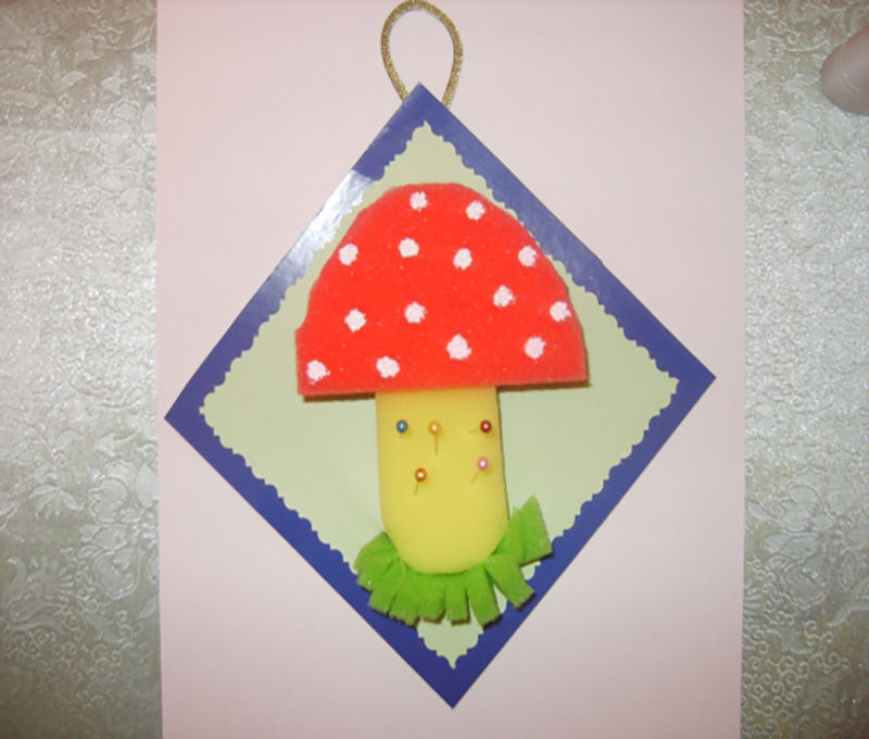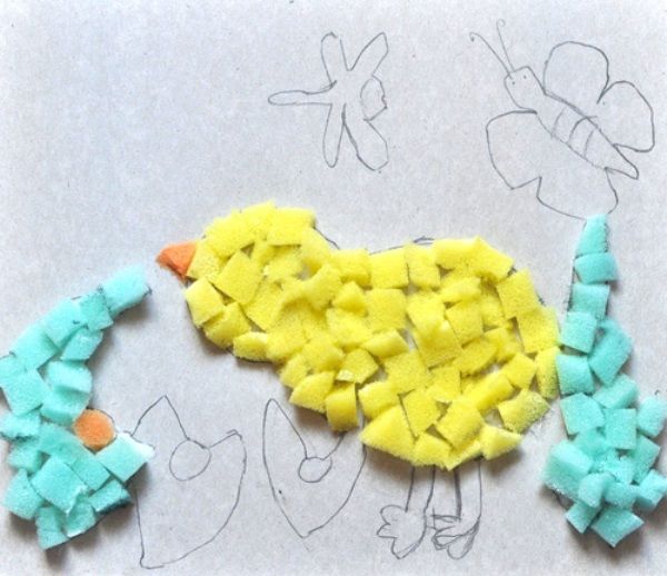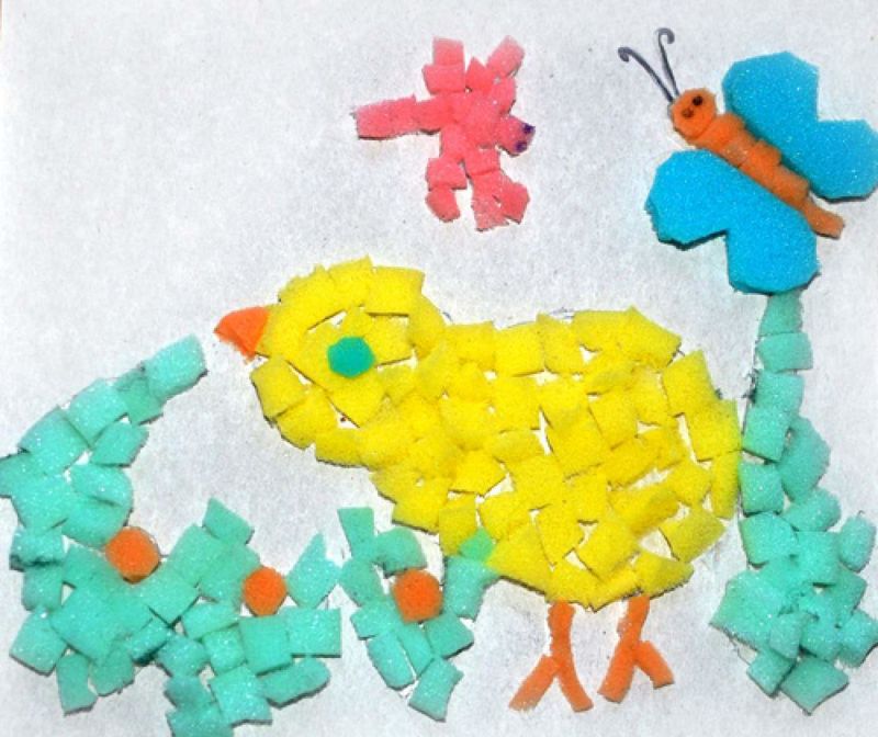 - Нарежете гъбите на малки парчета. По-сложните елементи, имитиращи крила на пеперуда, нос на пиле, се препоръчва да бъдат направени от родителите. По-леките елементи могат да бъдат изработени от самото дете. Подготвените парчета се използват за изработване на ръчна изработка от цветна гъба.