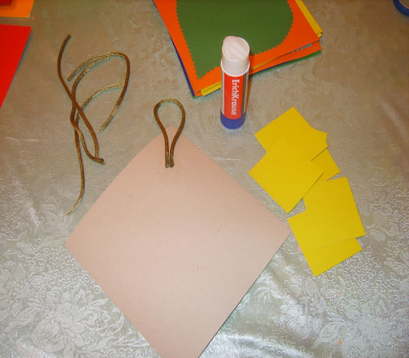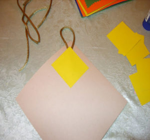 - Кутията за игли трябва да има примка, за да може да се закачи на повърхността на стената. За целта вземете тънка панделка и я оформете като примка. Тя може да се закрепи по два начина: от задната страна на картонената основа или като се постави между хартията и картонения квадрат. Подготвя се основата за занаята.