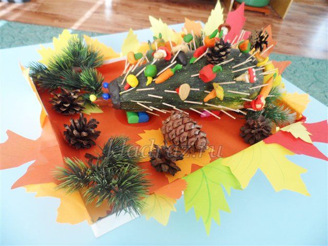 За таралежа е най-добре да се използва заострена в основата тиквичка. Тясната страна ще бъде дулото. Носът и очите могат да се направят от плодове. След това вземете клечки за зъби или запалки и ги забодете под формата на иглички по цялата горна част на тиквичката, с изключение на областта на муцуната.