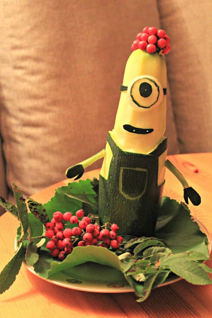 Поставете овалната тиквичка в изправено положение. За да не падне, направете ботуши от дълга тиквичка, като я разрежете по дължина на две части. С помощта на клечки за зъби ги прикрепете към тялото.