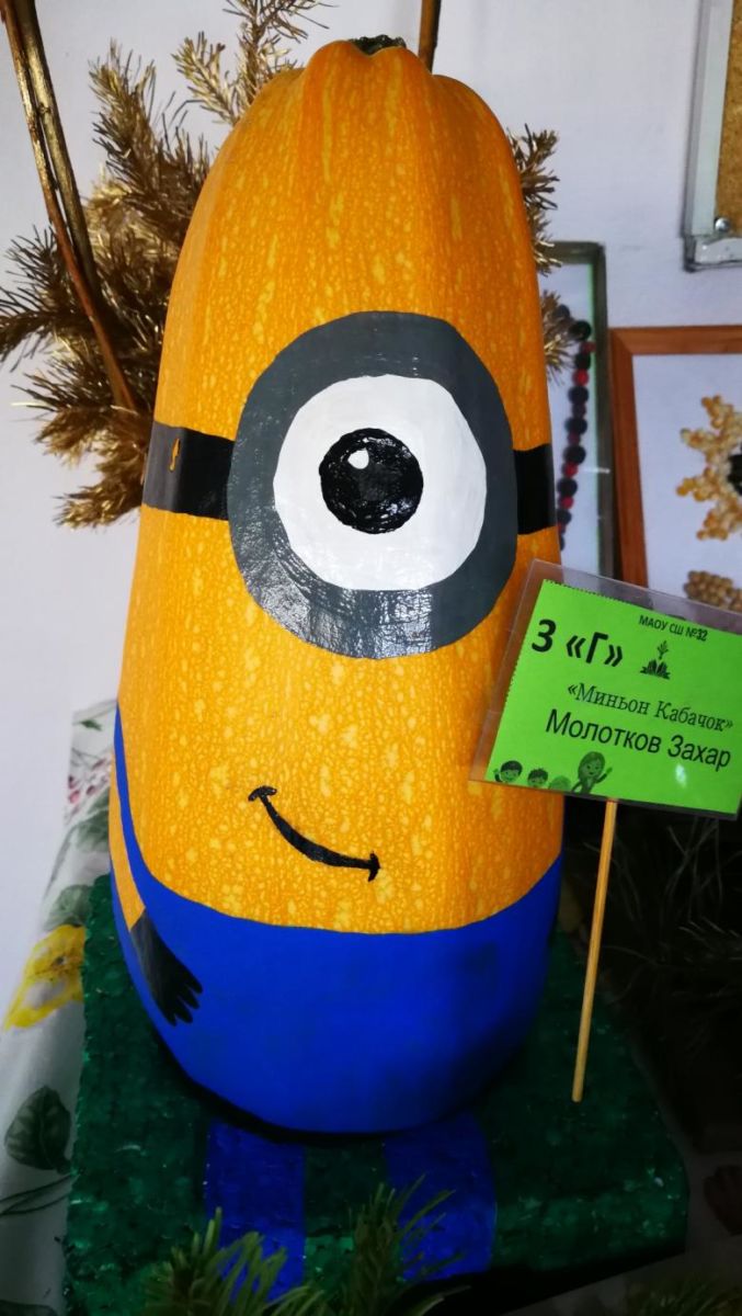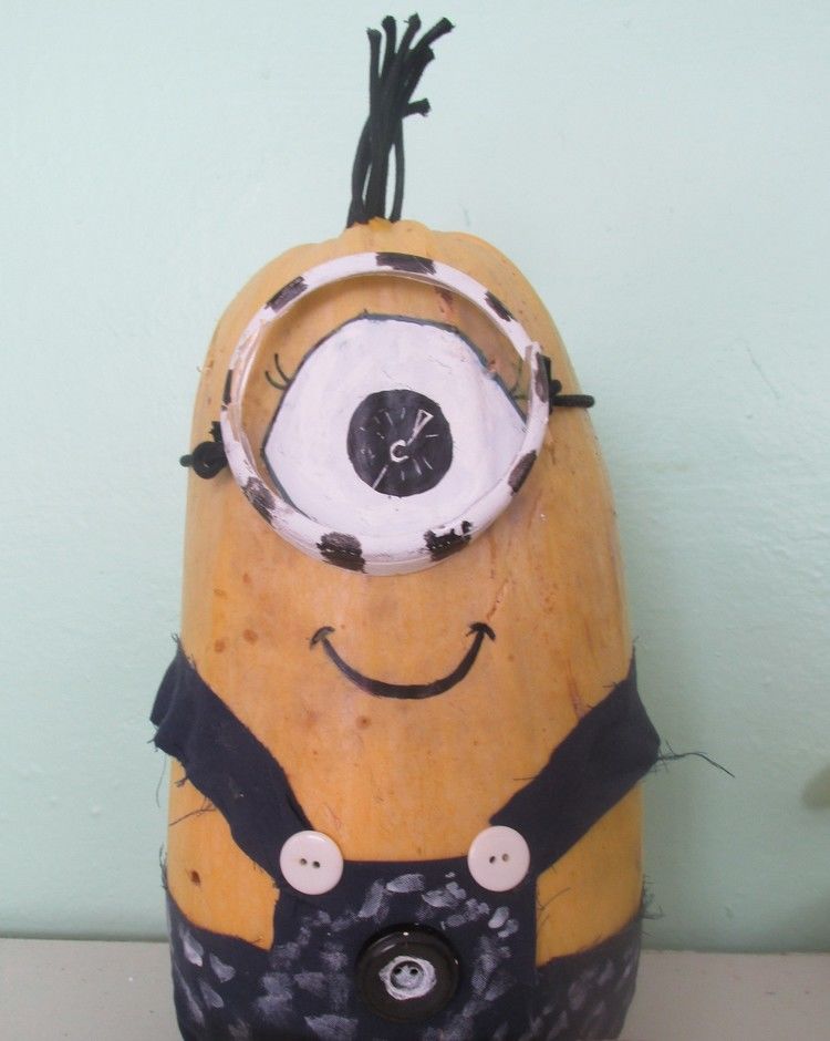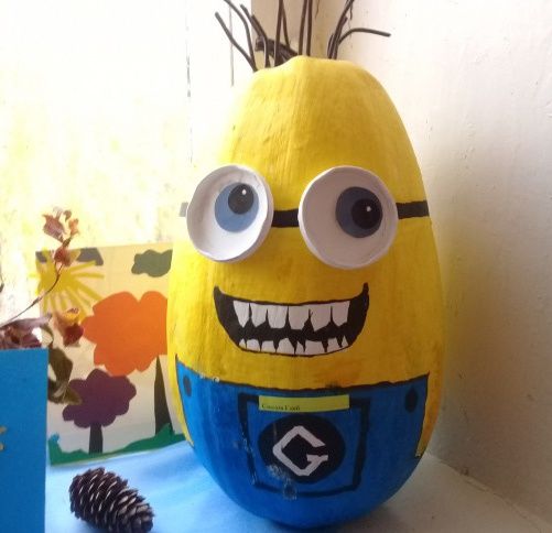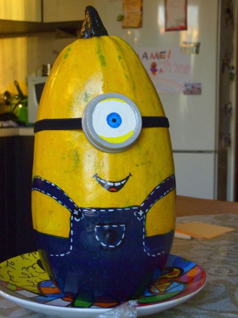 С малко въображение тиква или тиквичка може да се превърне в миньон. Използвайте жълт зеленчук с овална форма. Останалите детайли трябва да се боядисат. Акрилните бои са по-добри, тъй като са непрозрачни и водоустойчиви, за разлика от акварелните. Необходими са ви: