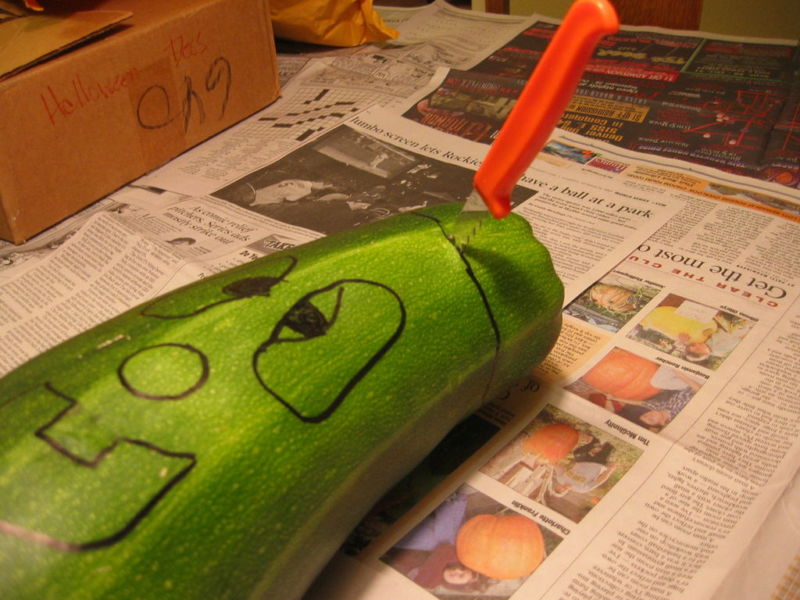Ако нямате такъв нож, можете да използвате обикновен малък нож. За начинаещите е най-добре първо да нарисуват модела върху повърхността на тиквичката. Удобно е да използвате и шаблони. Карвингът може да се напръска с лимонов сок, за да се предотврати потъмняването му.