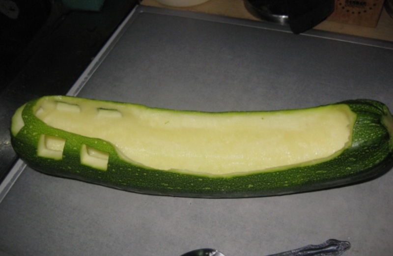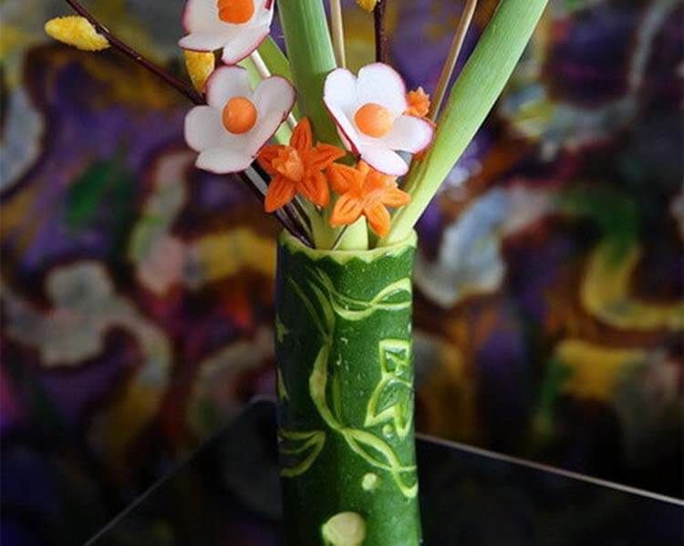 Отрежете тиквичката от двете страни. С помощта на лъжица отстранете пулпата и семената от едната страна. Получената ваза може да бъде украсена с нож за резба или с техника за резба.