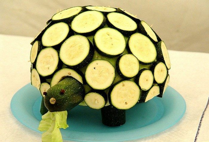 Нарежете една тиквичка напречно на 6 парчета. Външните части ще бъдат главата и опашката, а останалите 4 части ще бъдат лапите. Нарежете втората тиквичка на кръгчета и я прикрепете към черупката с клечки за зъби. Прикрепете главата, лапите и опашката по същия начин.