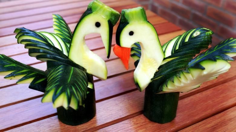 Зеленчуците трябва да са с еднакъв размер. Разрежете една тиквичка на половина по дължина. Това ще са крилата. От втората тиквичка изрежете два правоъгълника в горната и долната част, където са прикрепени крилата.