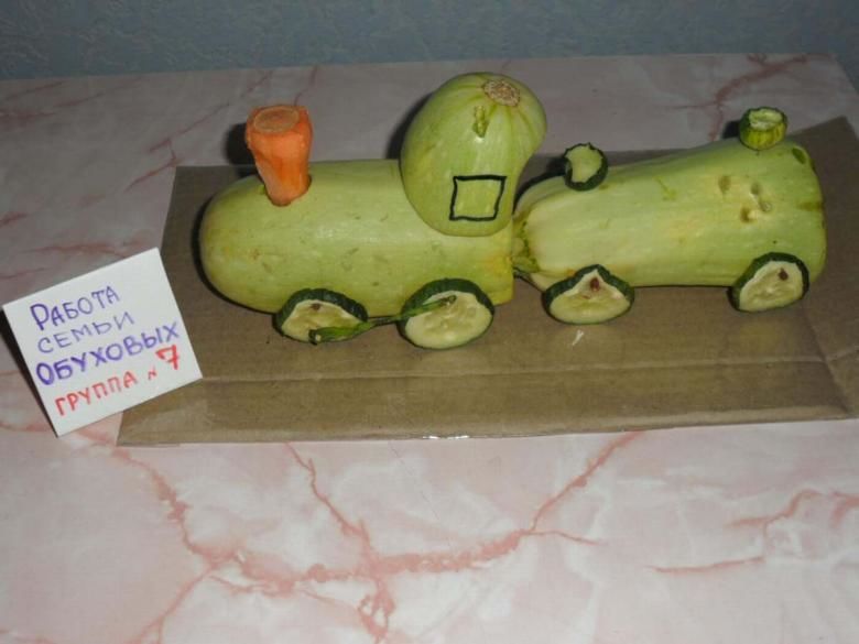 Сред различните видове транспорт, които можете да направите от тиквички, има и парен влак. Изработката му е също толкова лесна, колкото и на другите занаяти. Необходими са следните компоненти: