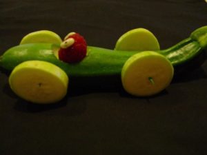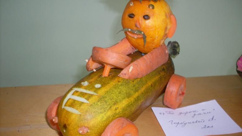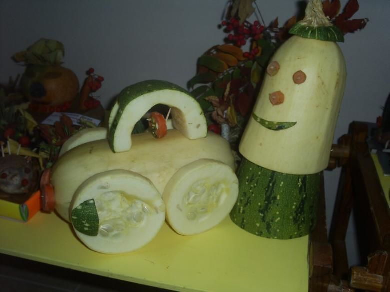 Друга възможност за изработка, която ще се хареса особено на момчетата, е кола от тиквички. Основата е цяла тиквичка с колелца от кръгчетата на друга тиквичка. За тази занаятчийска дейност са ви необходими: