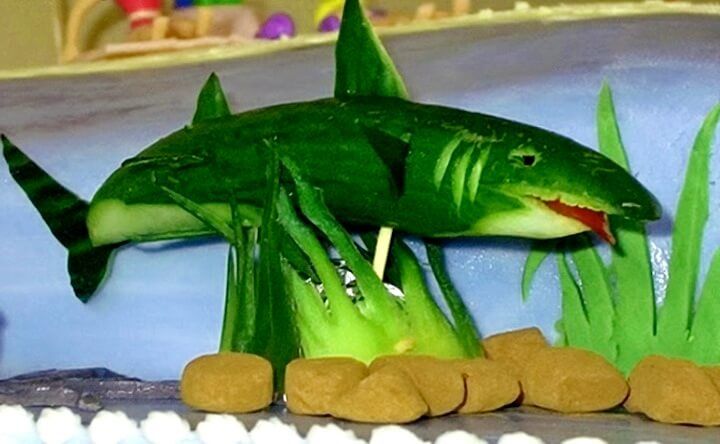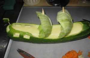 От парчета тиквичка може да се направят перки и опашка. Направете дупка в горната част с клечка за зъби и поставете стръкче магданоз, за да образувате фонтан. Очите могат да се направят от пластилин или зърна черен пипер.