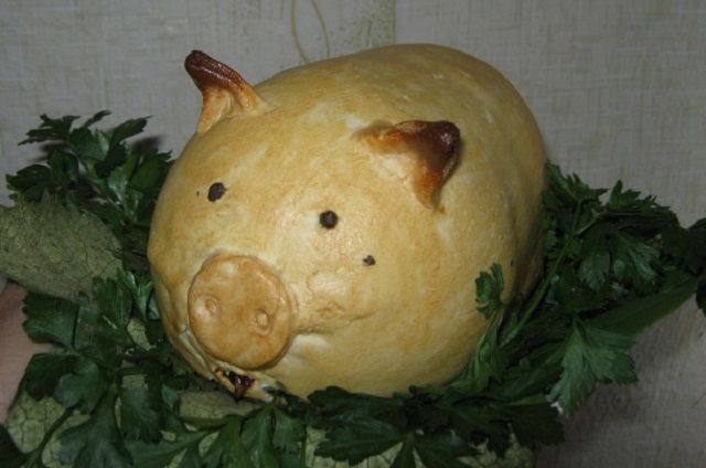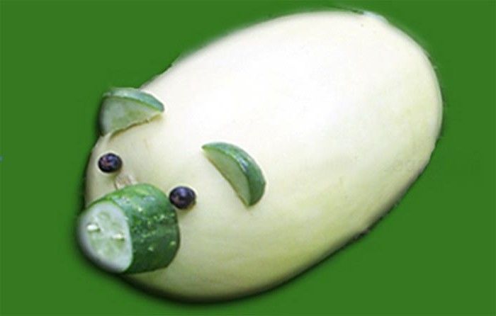 Ако тиквичката няма собствена опашка, тя може да се направи от морковени кори. Направете две малки вдлъбнатини с върха на ножа в областта, където ще бъдат очите, и поставете зърната черен пипер в тях. Поставете прасенцето на подготвено място със зеленина или листа.