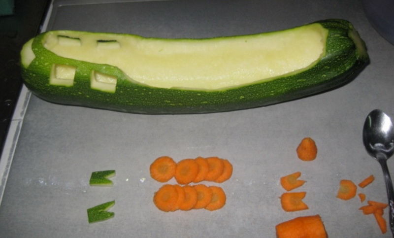 Тиквичките трябва да са с приблизително еднакъв размер. Притиснете две тиквички една към друга с помощта на шишчета. Разрежете третата тиквичка напречно наполовина. Поставете едната половина върху основния вагон, като я закрепите с шишовете.