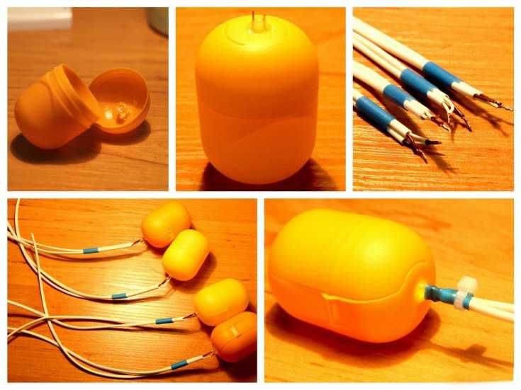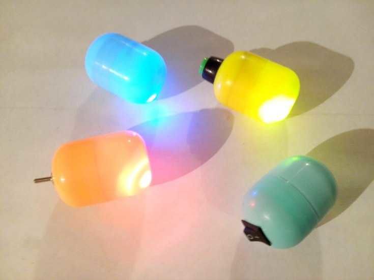 За целта направете отвор в капсулата с диаметър, равен на диаметъра на светодиода, вкарайте го вътре и го залепете. Украсете капсулата по желание.