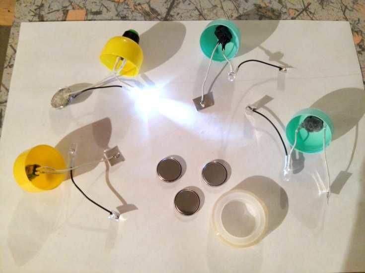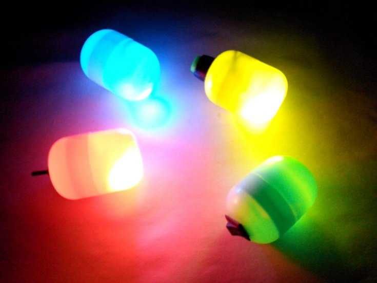 - С помощта на възрастните можете да направите истински светещ многоцветен гирлянд, като завиете LED крушка във всяка капсула. Проводниците са свързани във верига.