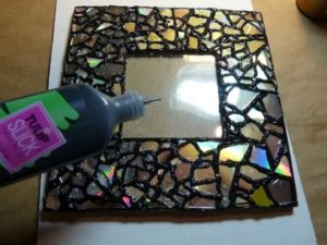 - Ако използвате един диск за изработката, просто прикрепете предварително подготвената пластина към гърба на диска. Ако първоначално са били планирани няколко диска, използвайте пистолет за лепене, за да създадете композиция;