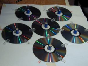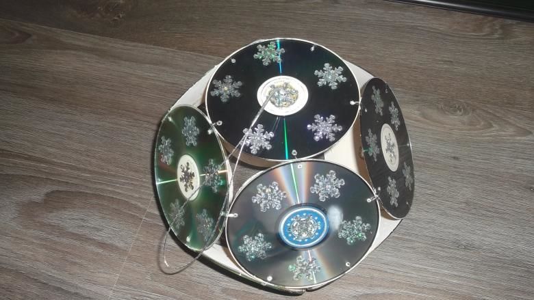Трябва само да изградите конструкция, на която да се закрепят дисковете, така че отблясъците да се виждат от всички страни. Самите компактдискове могат да бъдат закрепени с каквото пожелаете: щипки за хартия (трябва да направите дупки в краищата), въдица, конец и т.н.