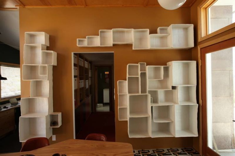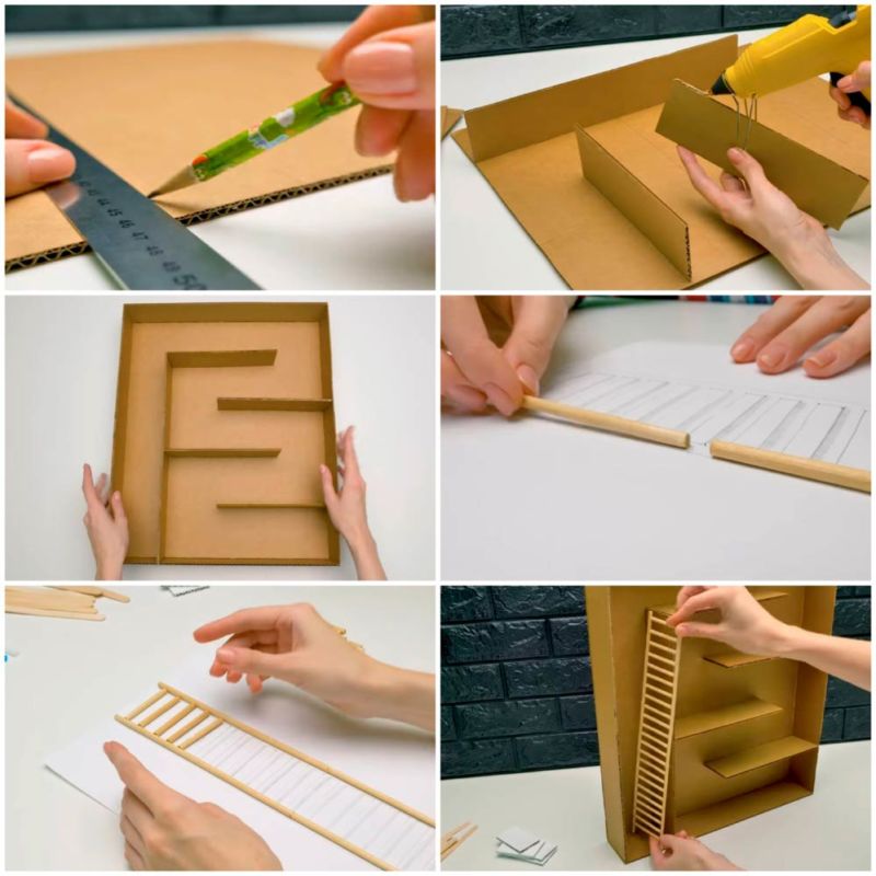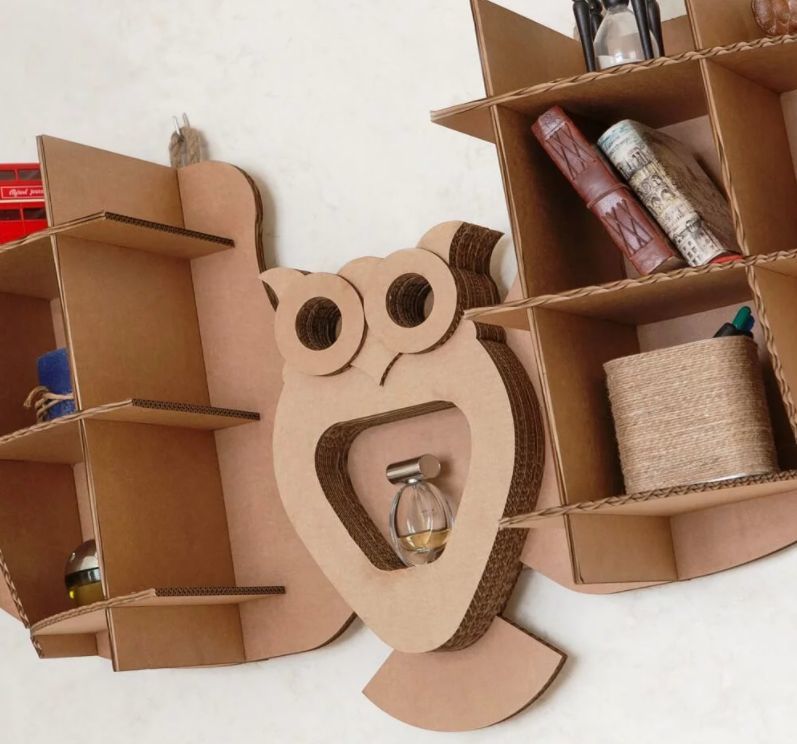 Ако картонът е здрав, можете да изрежете оформени рафтове с ниши за декоративни предмети, фигурки и книги (но не прекалено тежки).